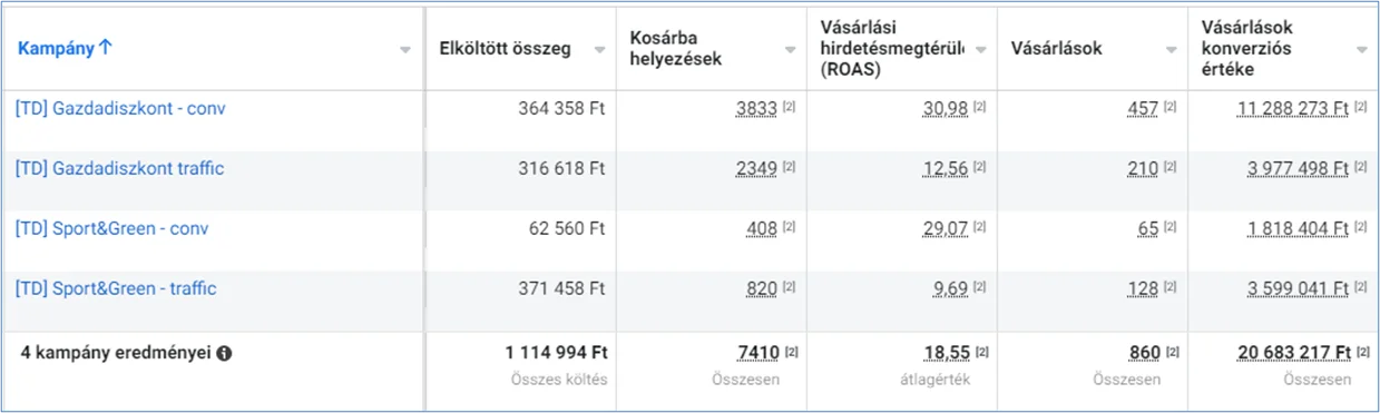 Különböző kampánytípusok alkalmazása: A forgalom alapú kampányok és a konverziós kampányok kombinálása biztosította a magas megtérülést.